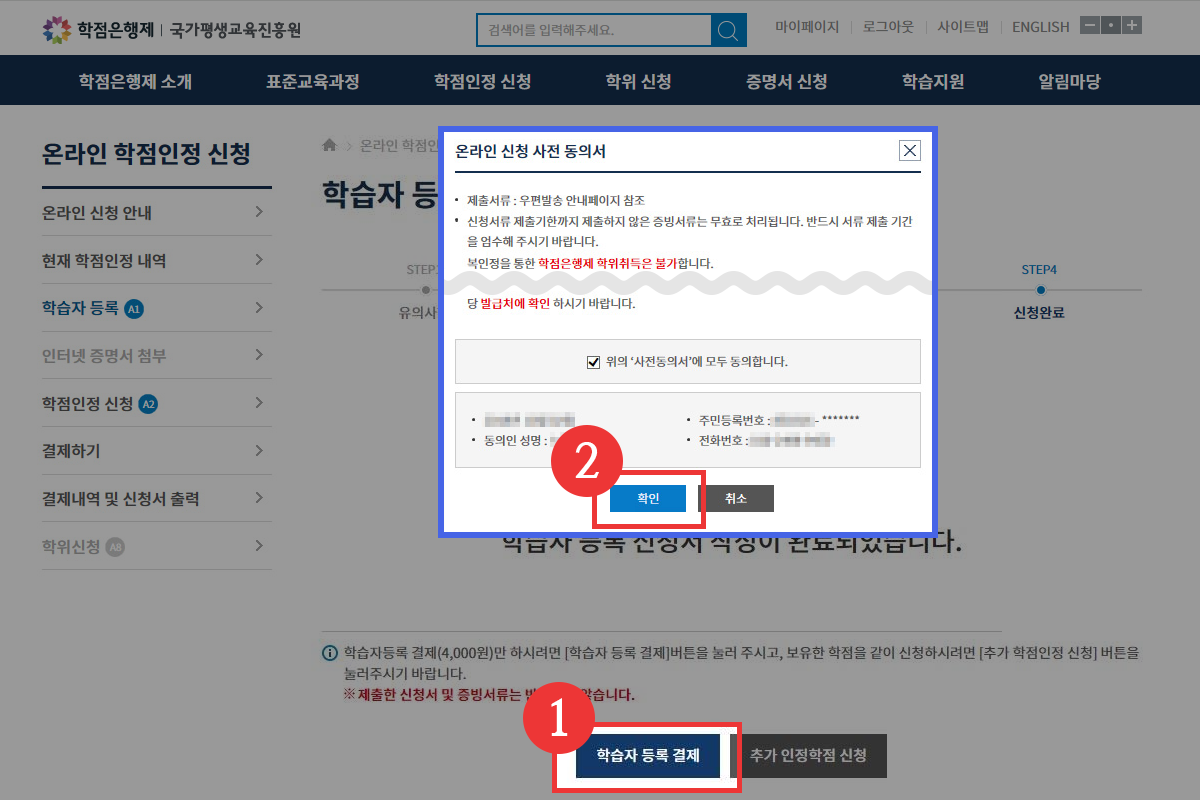 학습자 등록 신청서 작성 및 학습자 등록 결제가 완료된 이후, 본인의 진행 과정에 따라 학점인정신청,인터넷 증명서 첨부 단계를 진행 해주시면 됩니다.