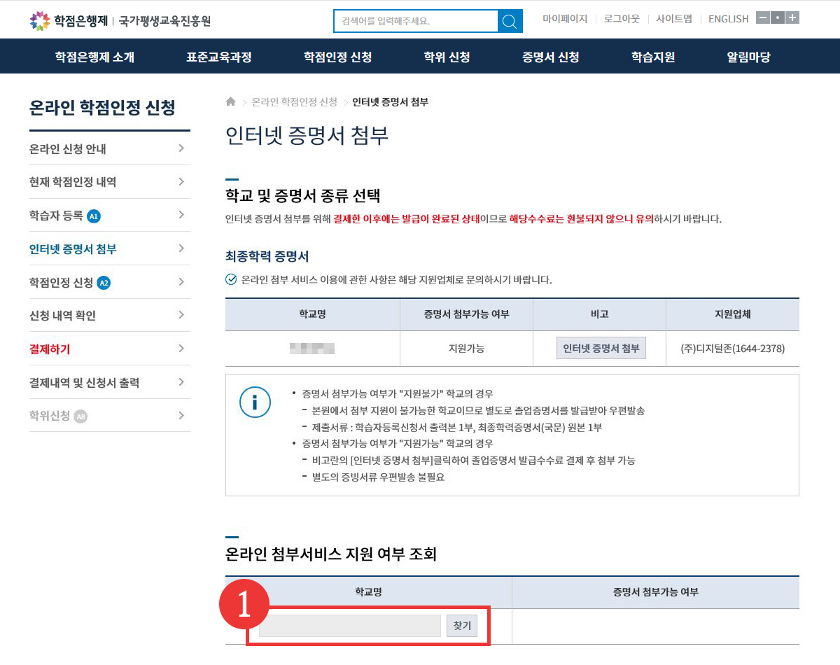 그 외, 최종출신교에서 [인터넷 증명서 지원 가능]으로 조회된 학습자는 3단계 [인터넷 증명서 첨부]에서 최종학력증명서를 온라인 첨부하시면 됩니다.