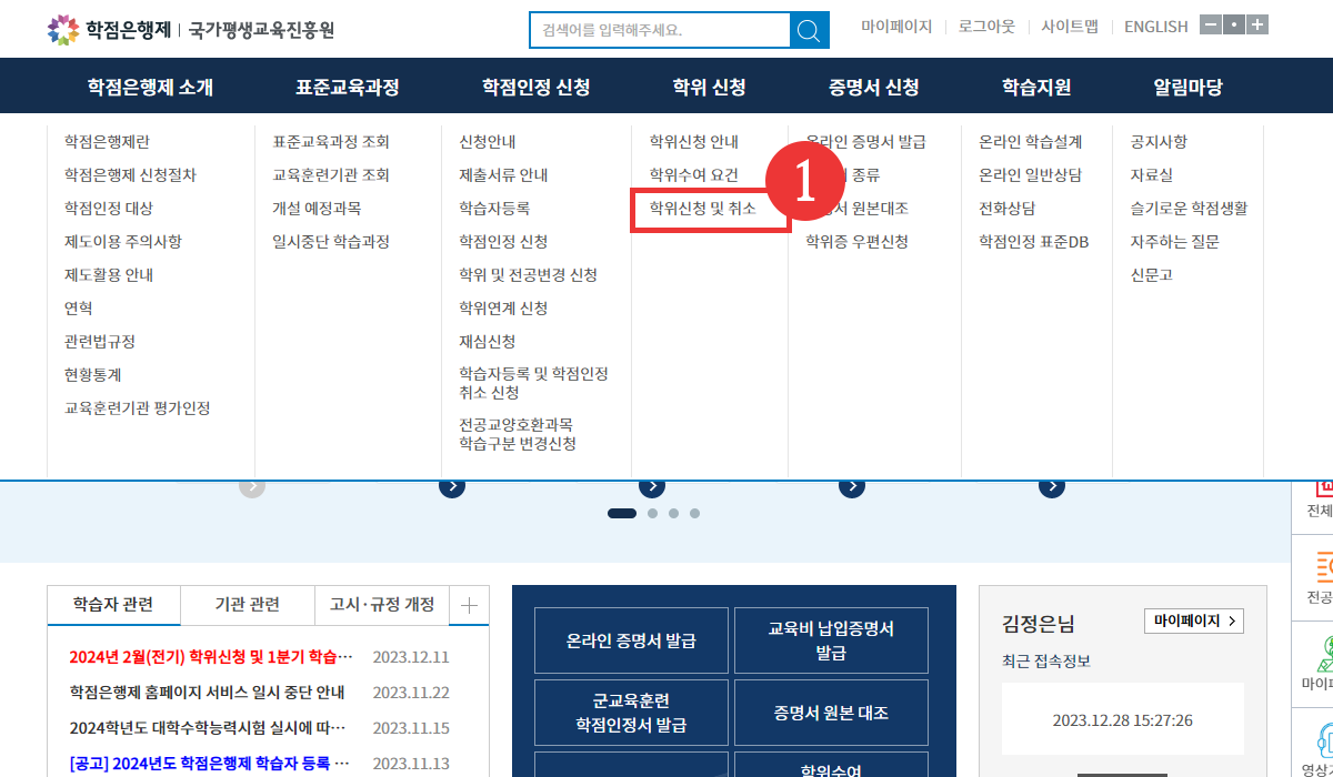 03. 홈페이지 상단 [학위신청 및 취소] 메뉴 클릭