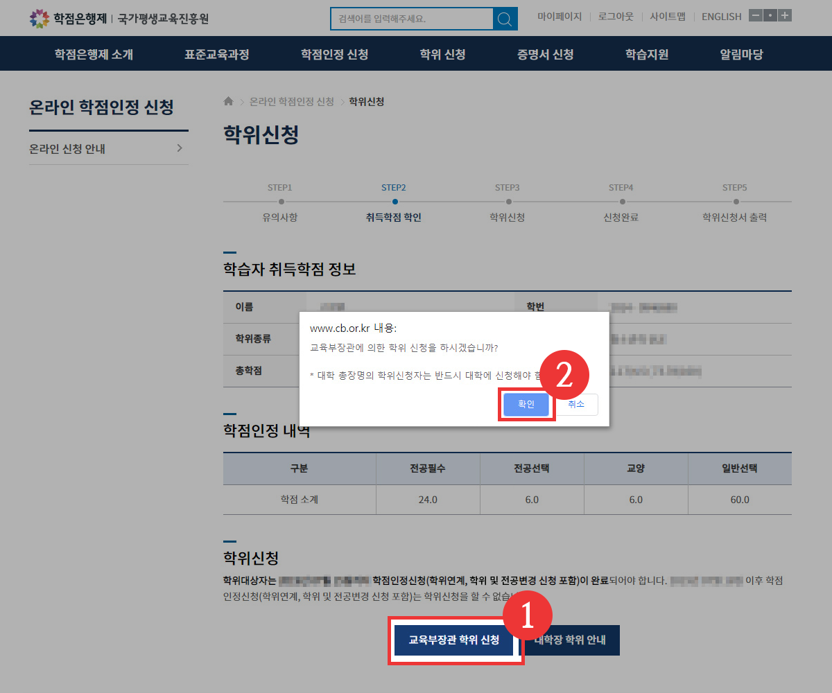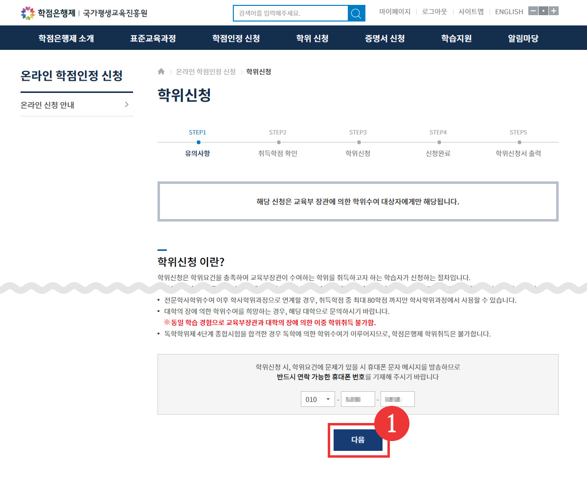 • 5-1. 안내 내용 확인 및 페이지 하단 [교육부장관 학위 신청] 버튼 클릭