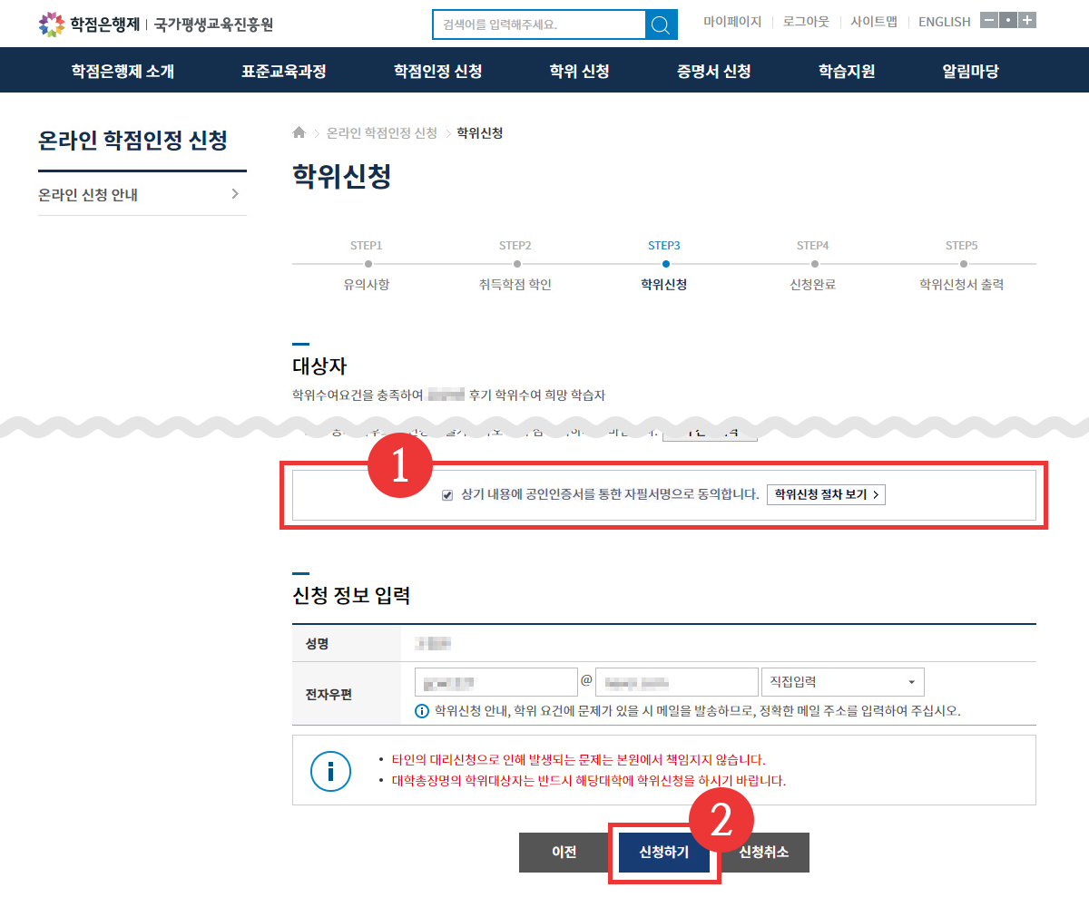 05. 안내 내용 확인 및 페이지 하단 [교육부장관 학위 신청] 버튼 클릭