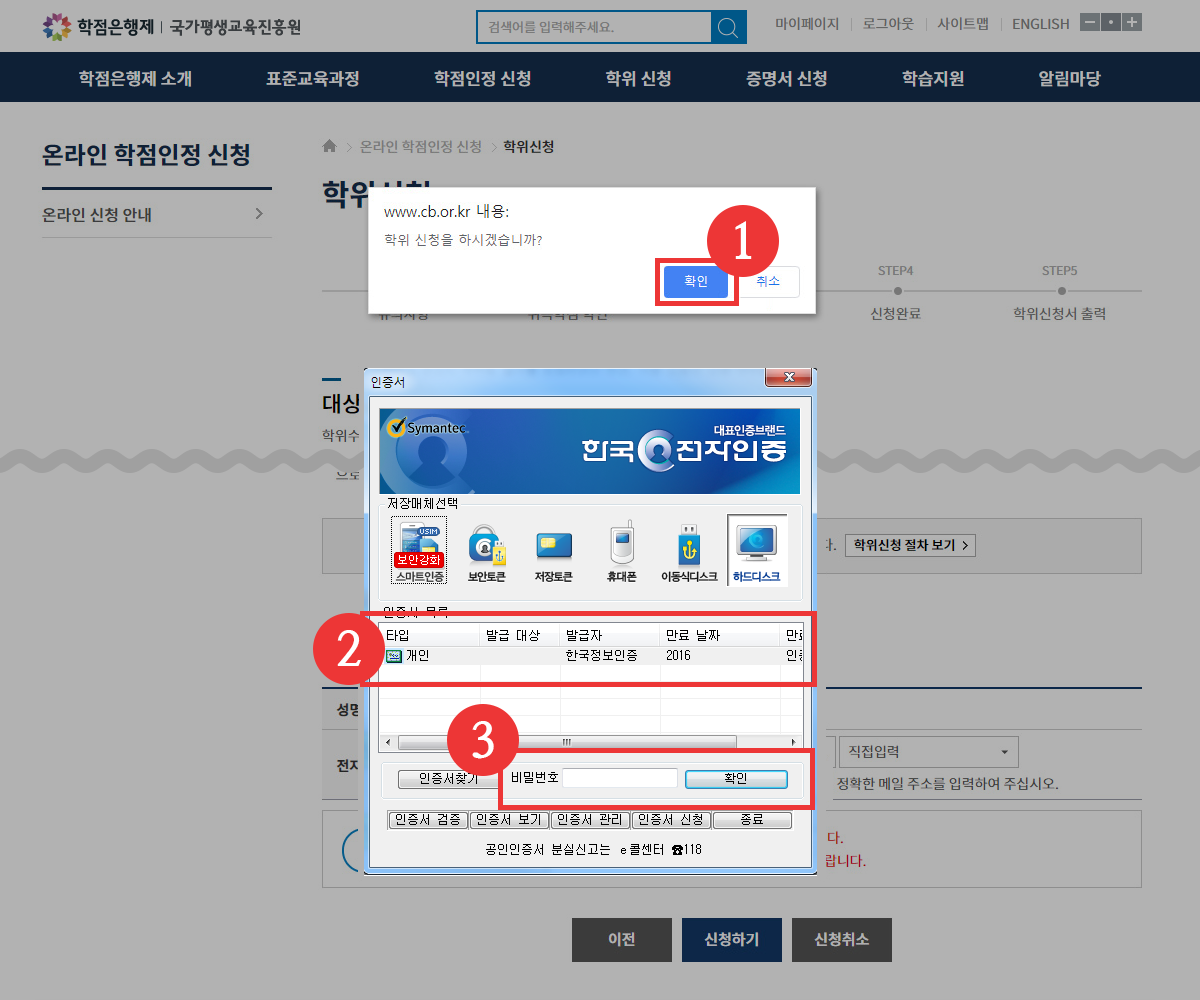 07. 학위 신청 알림창 내 [확인]버튼 클릭 후 공인인증서 본인 확인 절차 진행