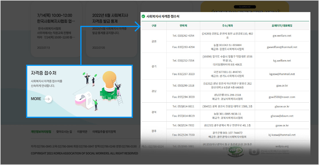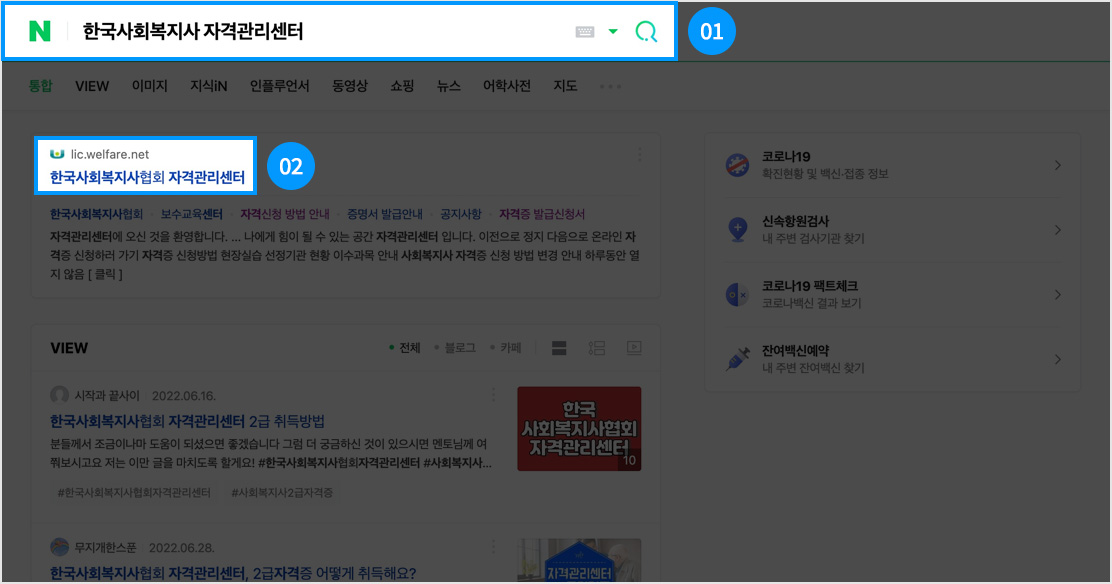• 2-2. 검색결과 상단 [한국사회복지협회 자격관리센터] 메뉴 클릭