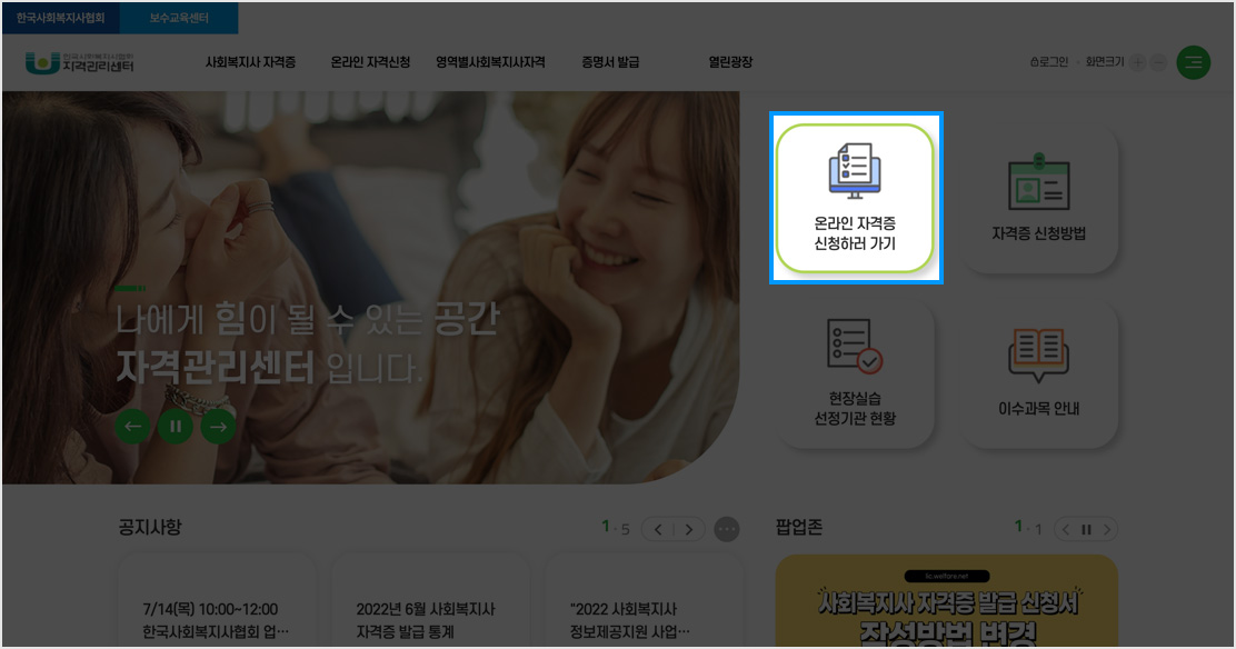 05. 사회복지사 자격관리센터 메인 [온라인 자격증 신청하러 가기] 클릭