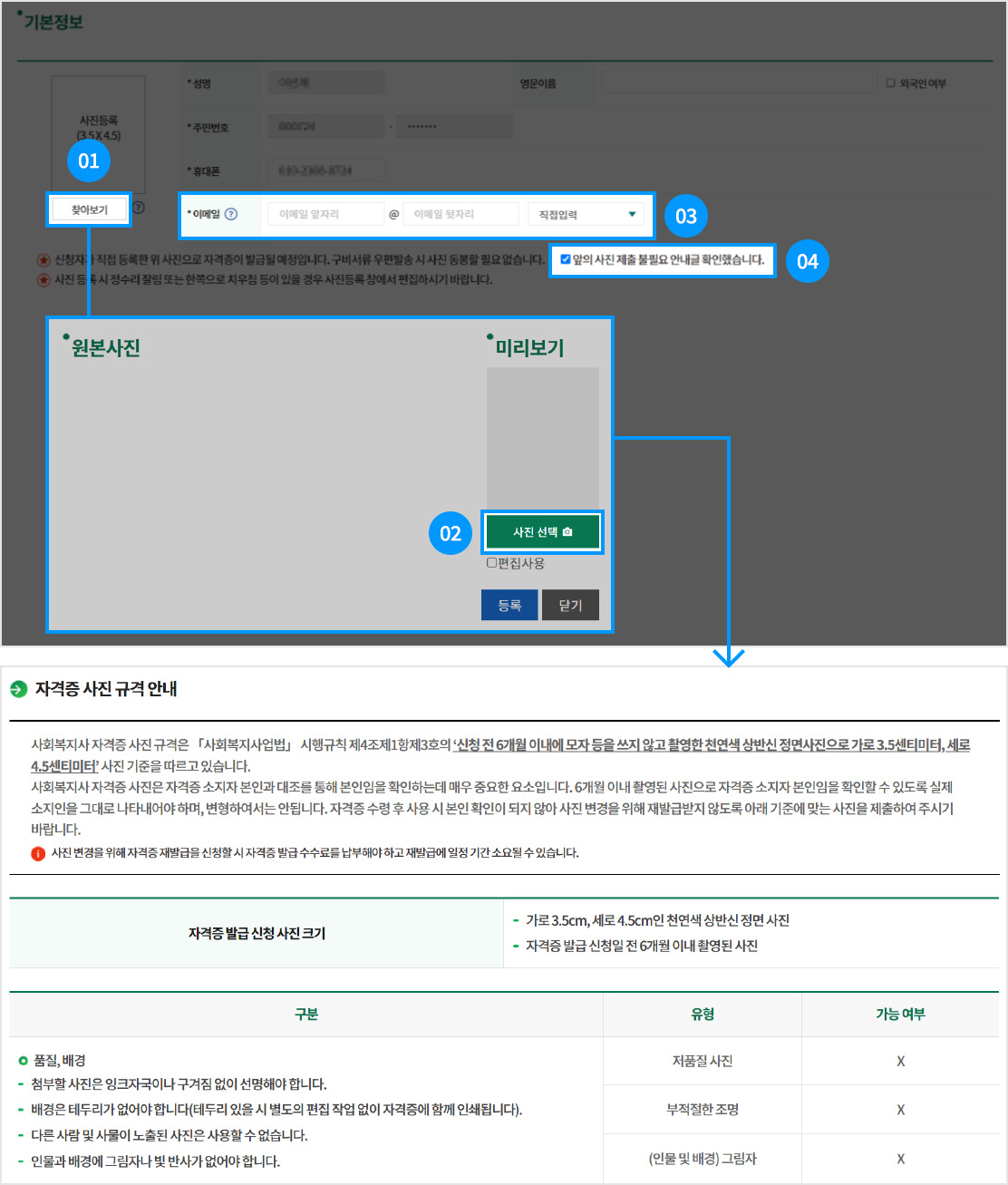 • ※ 온라인 등록한 사진으로 자격증이 발급 될 예정입니다. 구비서류 우편발송 시 사진은 동봉하지 않으셔도 됩니다.
