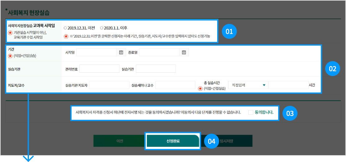 2020.01.01 이후(신법대상자): 2020.1.1이후 체크 하고 하단 내용 모두 입력하고, ④ 신청완료 클릭