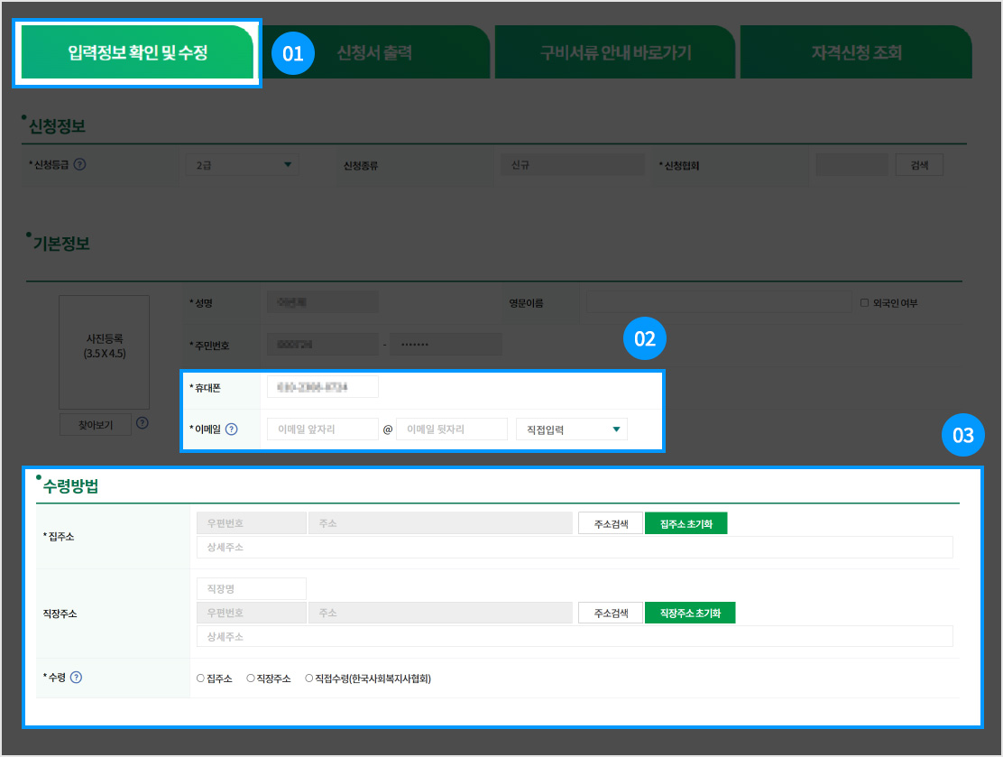 • ※ 기본정보(휴대폰 이메일), 수령방법을 제외한 정보는 수정할 수 없으며 자격 판정 전까지만 수정 가능
